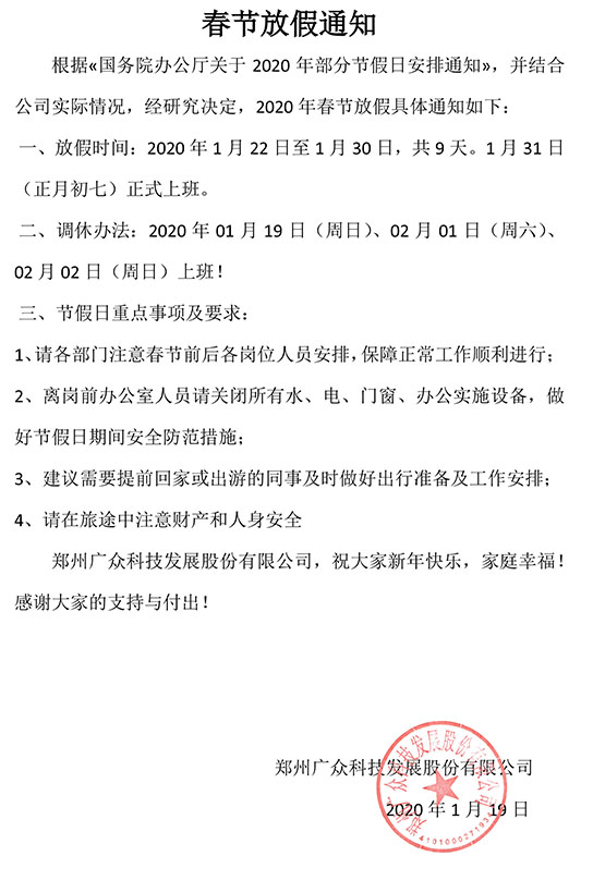 根據(jù)?國(guó)務(wù)院辦公廳關(guān)于2020年部分節(jié)假日安排通知?,并結(jié)合公司實(shí)際情況,經(jīng)研究決定,2020年春節(jié)放假具體通知如下: