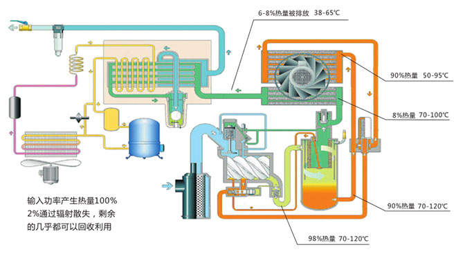 根據(jù)統(tǒng)計(jì),空壓機(jī)在運(yùn)行的時(shí)候,真正的用于增加空氣勢(shì)能所消耗的電能,在總耗電量中只占了很小的一部分,大約15%,大約85%的電能轉(zhuǎn)化為熱量,通過(guò)風(fēng)冷或者水冷的方式排放到空氣中。如果這些多余的熱量不加利用任由他們排放到空氣中,會(huì)對(duì)環(huán)境進(jìn)行影響,制造熱的污染。