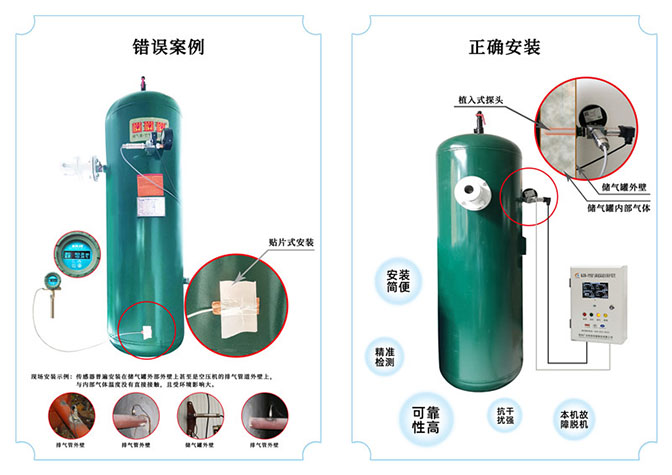 1,儲(chǔ)氣罐打孔不打孔?廣眾科技生產(chǎn)的儲(chǔ)氣罐超溫超壓保護(hù)裝置不打孔,保持原有空壓機(jī)和儲(chǔ)氣罐本身的結(jié)構(gòu)不改變,在儲(chǔ)氣罐安裝壓力表的位置擰下壓力表,采用長(zhǎng)三通、短三通來(lái)進(jìn)行連接溫度傳感器和壓力傳感器,不影響壓力表的安裝。