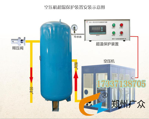 儲氣罐超溫保護裝置在超溫時候能自動切斷電源并報警,保護儲氣罐和空壓機的正常運行,鄭州廣眾科技公司根據(jù)空壓機特點和要求研制開發(fā)裝置,對空壓機儲氣罐溫度超標故障時候進行安全保護監(jiān)控。