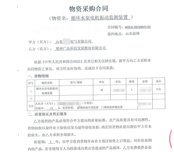 再迎喜訊:鄭州廣眾科技和合作伙伴簽約循環(huán)水泵電機(jī)振動(dòng)監(jiān)測(cè)裝置,合作伙伴為山東某電氣有限公司,終端使用為:國(guó)家電網(wǎng)廣固換流站。詳情如下: