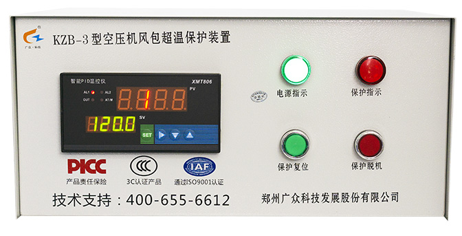 KZB-3型儲氣罐超溫保護裝置,也叫KZB-3型空壓機風(fēng)包超溫保護裝置,因為儲氣罐俗稱風(fēng)包,因此得名。鄭州廣眾科技發(fā)展股份有限公司生產(chǎn)的產(chǎn)品,采用高精度測控微處理器、數(shù)據(jù)存貯器、輸入、輸出開關(guān)量接口及鍵盤等組成。高精度測控微處理器分時檢測、處理設(shè)備接口電路輸入的數(shù)據(jù)信號,經(jīng)過程序的數(shù)據(jù)處理,再輸出至控制電路完成對空壓機和儲氣罐的超溫保護。數(shù)顯儲氣罐溫度檢測點的溫度超過溫度設(shè)定值時,裝置切斷空壓機急?;芈罚瑫r聲、光報警。