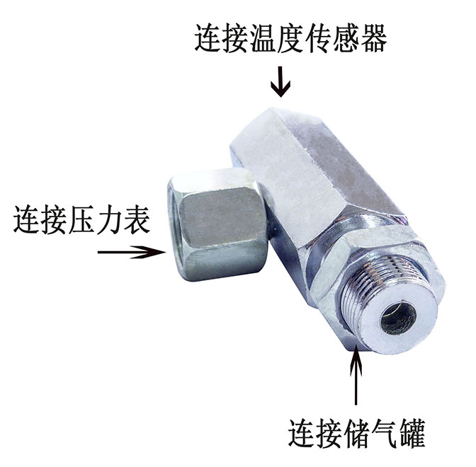 2,溫度傳感器安裝:一路溫度傳感器檢測儲氣罐溫度,溫度傳感器為高精度數(shù)字式熱電阻傳感器,安裝在儲氣罐對應(yīng)的檢測點,檢測點采用公司配備的長三通來進行連接: