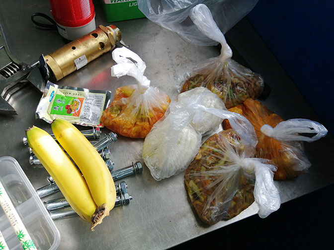 感動(dòng)送到安裝現(xiàn)場的飯菜,味道很好,還有水果: