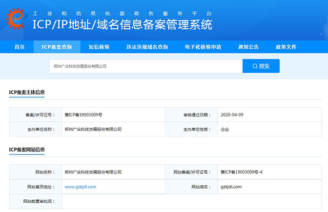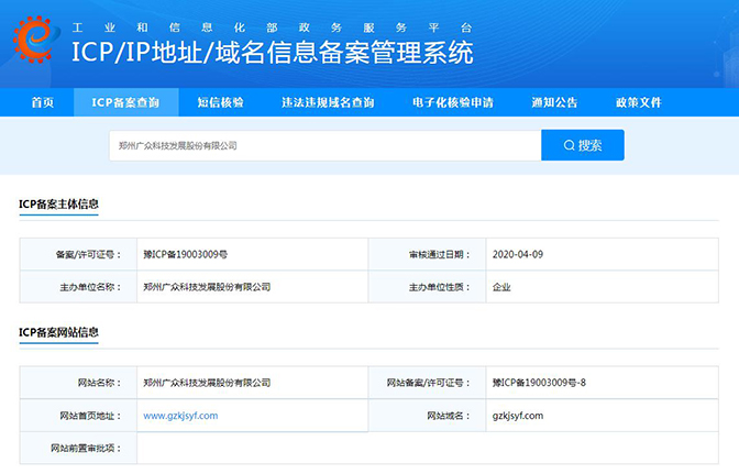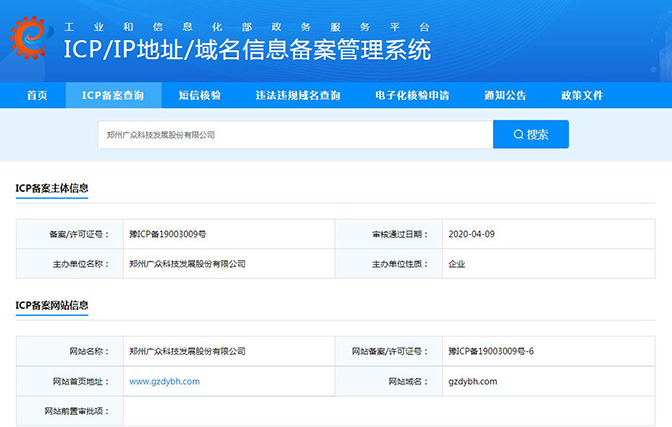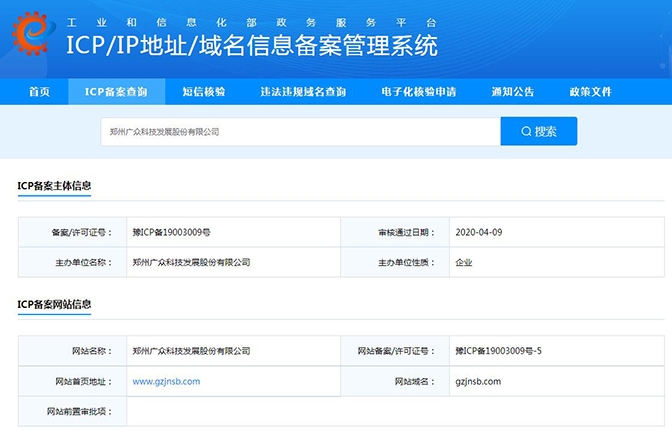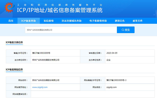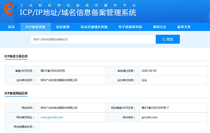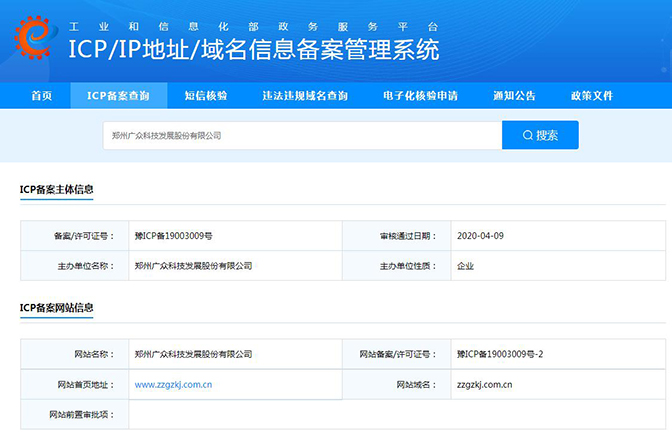 鄭州廣眾科技發(fā)展股份有限公司工信部備案官網(wǎng)