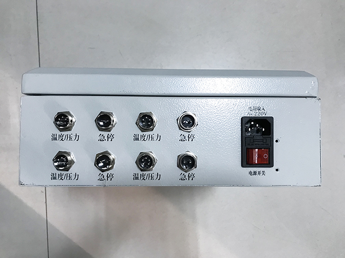 KZB-3型儲氣罐超溫保護裝置壁掛型為液晶顯示屏,電源、傳感器信號和控制信號端口在裝置下側(cè),如下圖,裝置含有4路溫度/壓力測量輸入接口和4個空壓機急停控制接口,每個儲氣罐的溫度和壓力測量接口,集成到一個5芯的航空插頭中,每臺空壓機單獨一個急??刂平涌?。如只監(jiān)測一臺儲氣罐數(shù)據(jù),只接一組即可,其他接口空余。