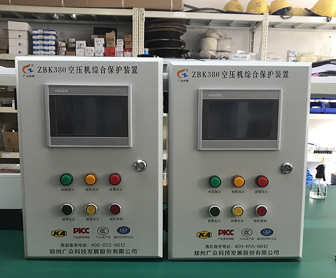 左上角為廣眾科技公司logo,上面正中間印刷產(chǎn)品名稱“ZBK380空壓機綜合保護裝置”,產(chǎn)品名稱下面是7寸真彩觸摸屏。