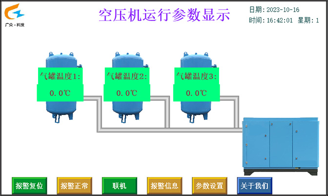 2,當(dāng)儲氣罐溫度在空壓機(jī)正常運行狀態(tài)下過高時,顯示屏報警滾動條顯示報警信息,正常狀態(tài)下不會顯示報警信息。