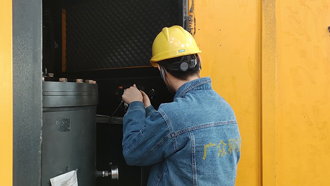 廣眾工程師在現(xiàn)場安裝空壓機(jī)斷油保護(hù)裝置