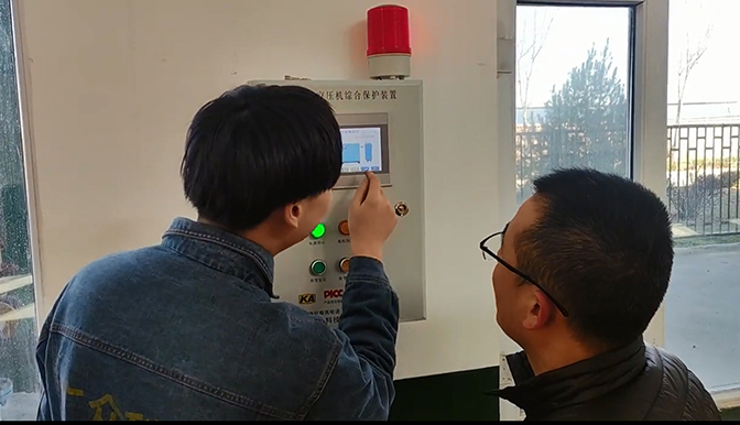 2,一套空壓機(jī)斷油保護(hù)裝置安裝完成,張工在為現(xiàn)場(chǎng)工作人員進(jìn)行操作講解: