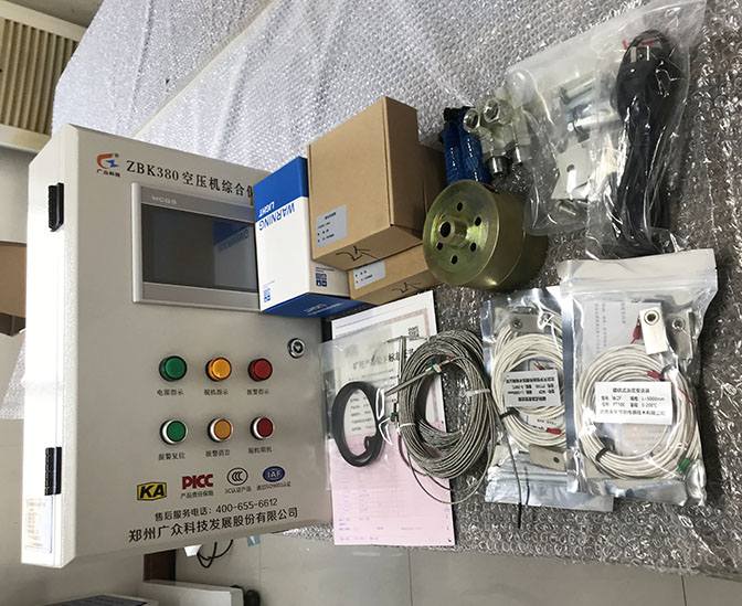 因?yàn)榘惭bZBK380型空壓機(jī)綜合保護(hù)裝置的位置和現(xiàn)場(chǎng)兩臺(tái)空壓機(jī)兩臺(tái)儲(chǔ)氣罐的距離不明,根據(jù)使用者要求,我方不配備線材,由使用方自行配備線材,其他輔件包含: