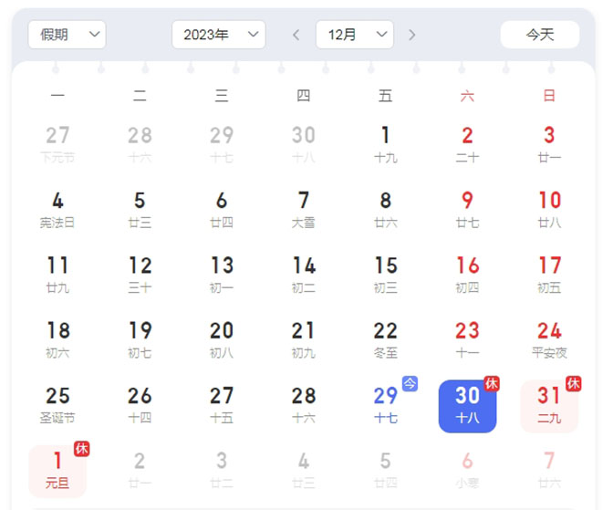 自2023年12月30日(星期六)開始至2024年1月1日(星期一)終止,2024年1月2日正式上班。