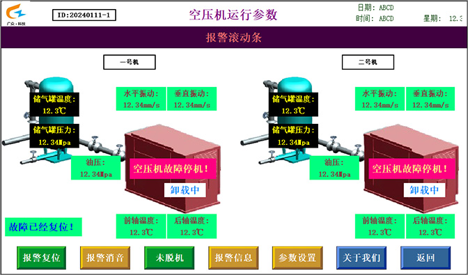 空壓機斷油保護(hù)綜合保護(hù)裝置功能:對2臺空壓機進(jìn)行斷油保護(hù)功能,對電動機進(jìn)行軸承溫度振動監(jiān)測,對儲氣罐進(jìn)行超溫超壓保護(hù)等。