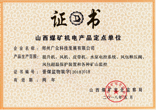 3,專利17項,自主著作權(quán)15項,ISO9001質(zhì)量管理體系認(rèn)證,山西省礦用產(chǎn)品定點生產(chǎn)廠家等相關(guān)資質(zhì)認(rèn)證。
