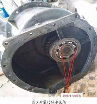 機(jī)動維修中心組織鉗工及專業(yè)技術(shù)人員進(jìn)行檢修。檢查發(fā)現(xiàn),機(jī)組盤不動車,空壓機(jī)機(jī)頭一套軸承支架斷裂,如圖所示。使軸承失去原有配合精度,螺桿的軸向竄量和徑向間隙增大,讓螺桿與螺桿之間,螺桿與主機(jī)殼體及前后端面之間的間隙發(fā)生變化,導(dǎo)致機(jī)頭螺桿相互抱死。因此,這是一次因軸承支撐架開裂導(dǎo)致空壓機(jī)機(jī)頭螺桿卡死的嚴(yán)重設(shè)備故障。